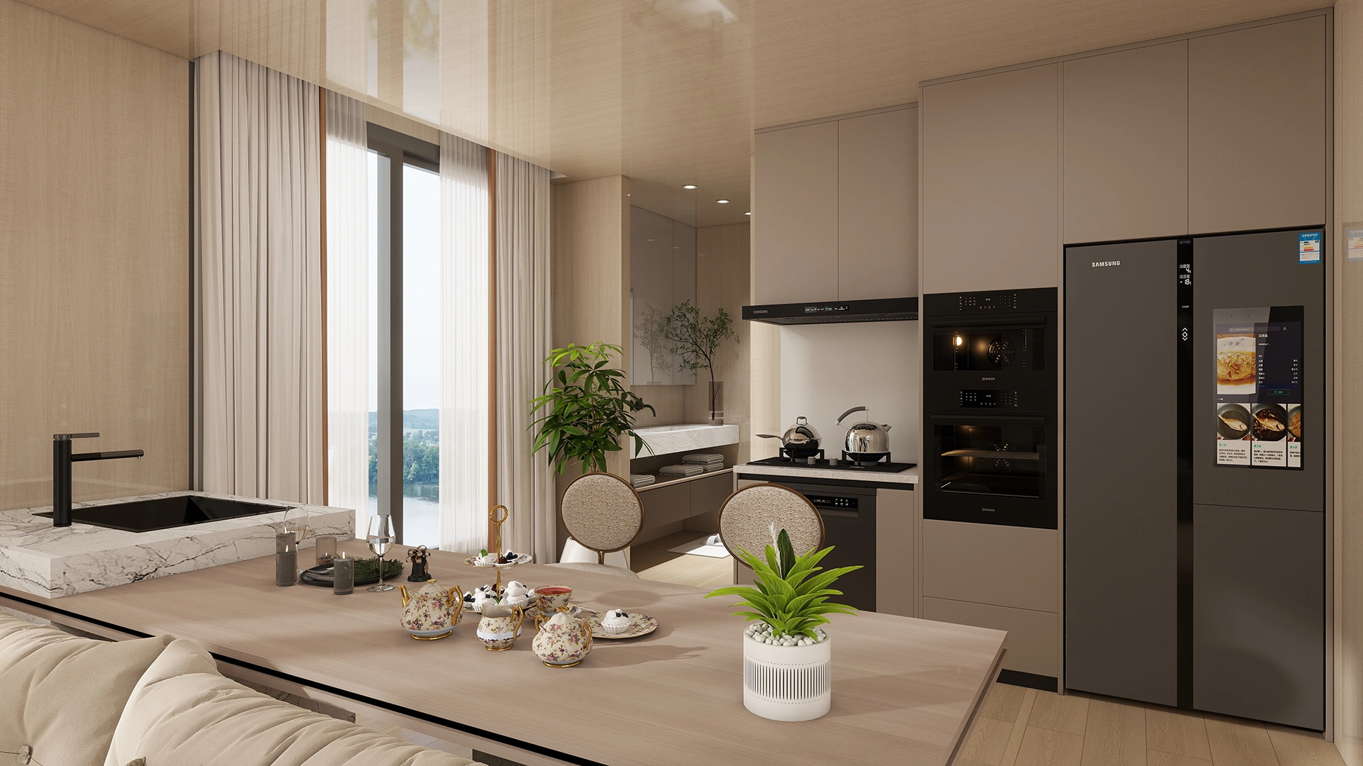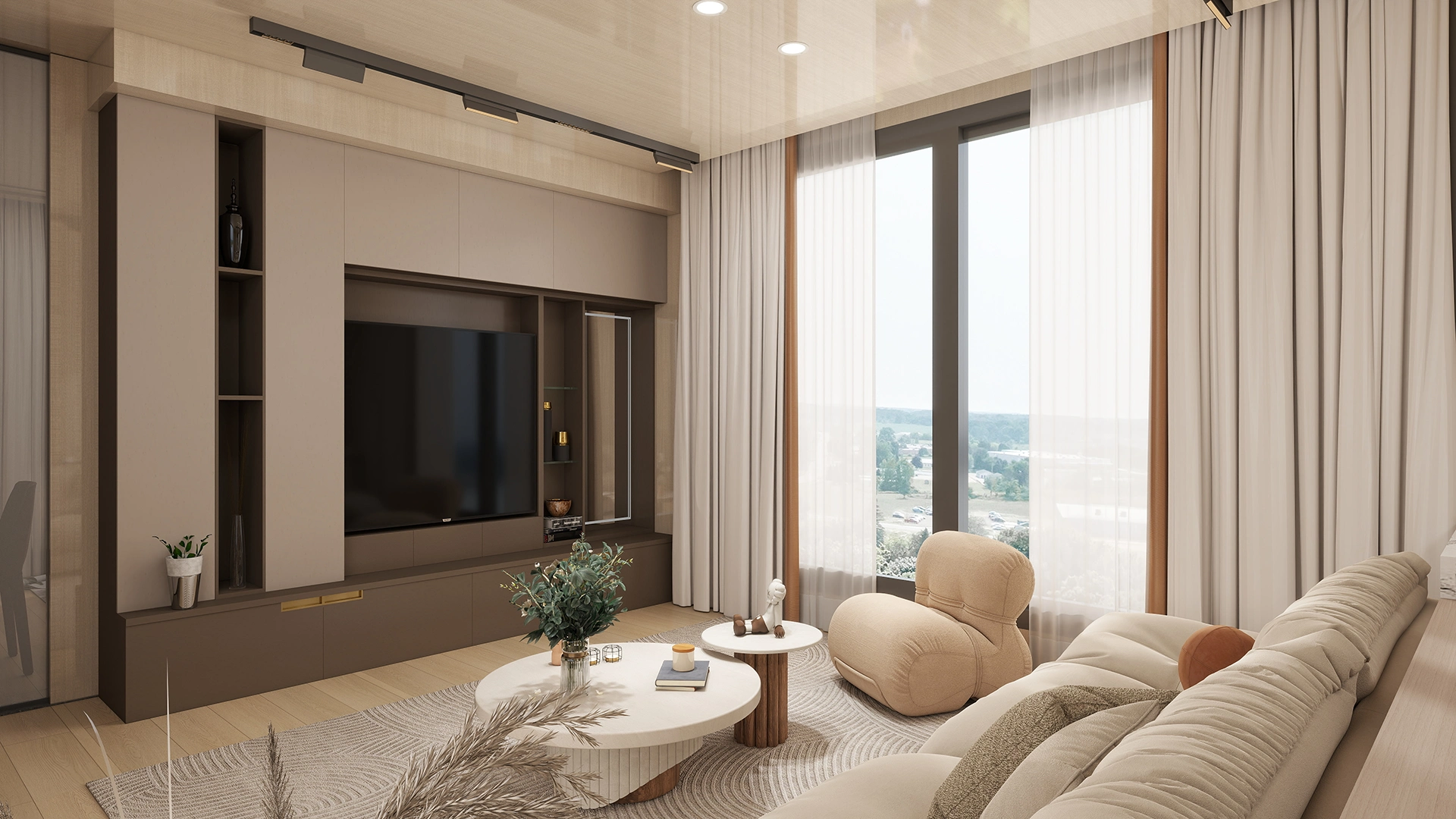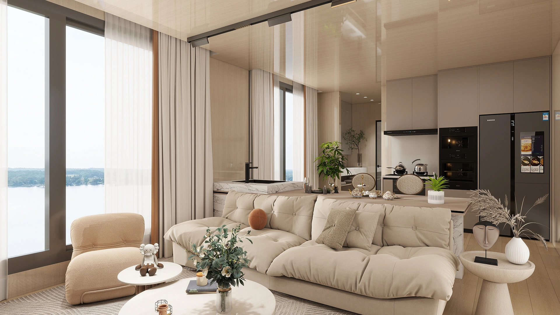 Modern Comfort: An open kitchen and living area create a spacious social environment, while two private bedrooms ensure rest. The minimalist style uses neutral colors and natural light for a warm atmosphere.