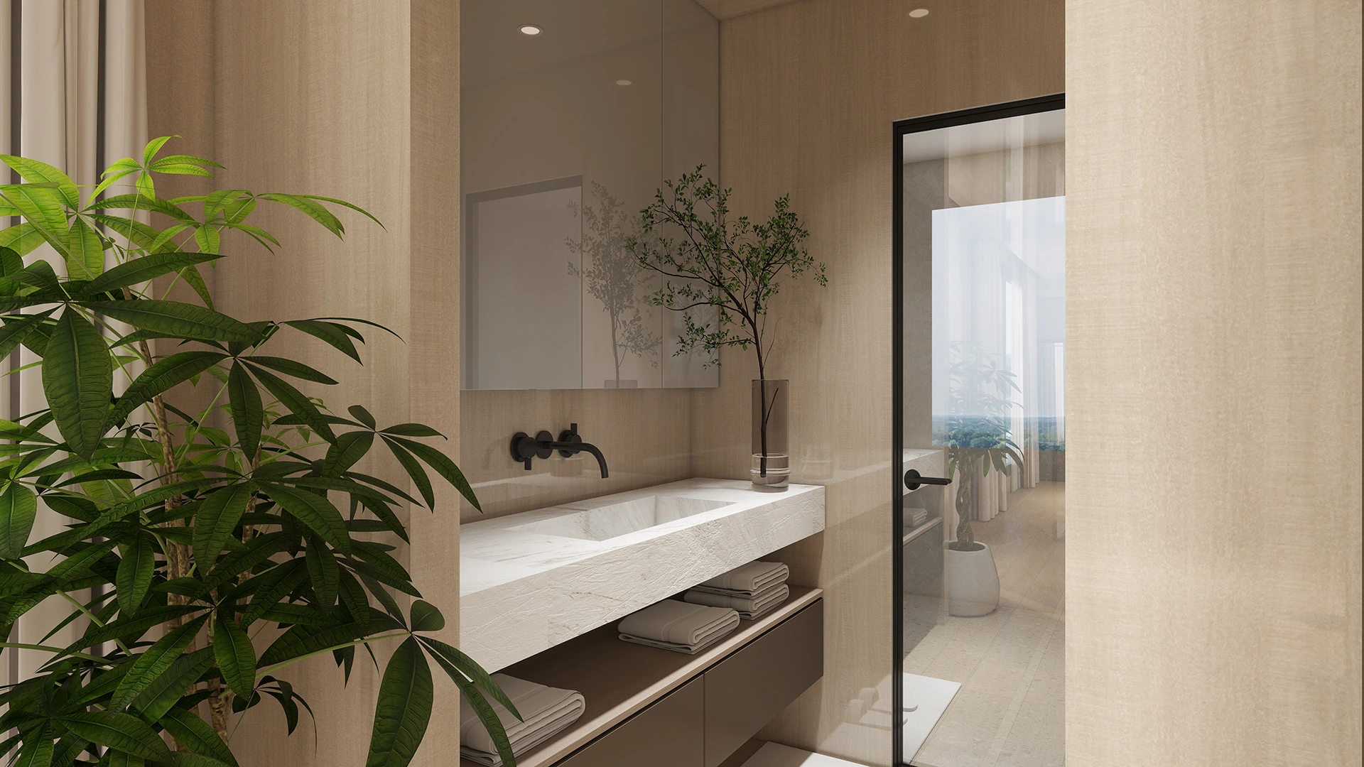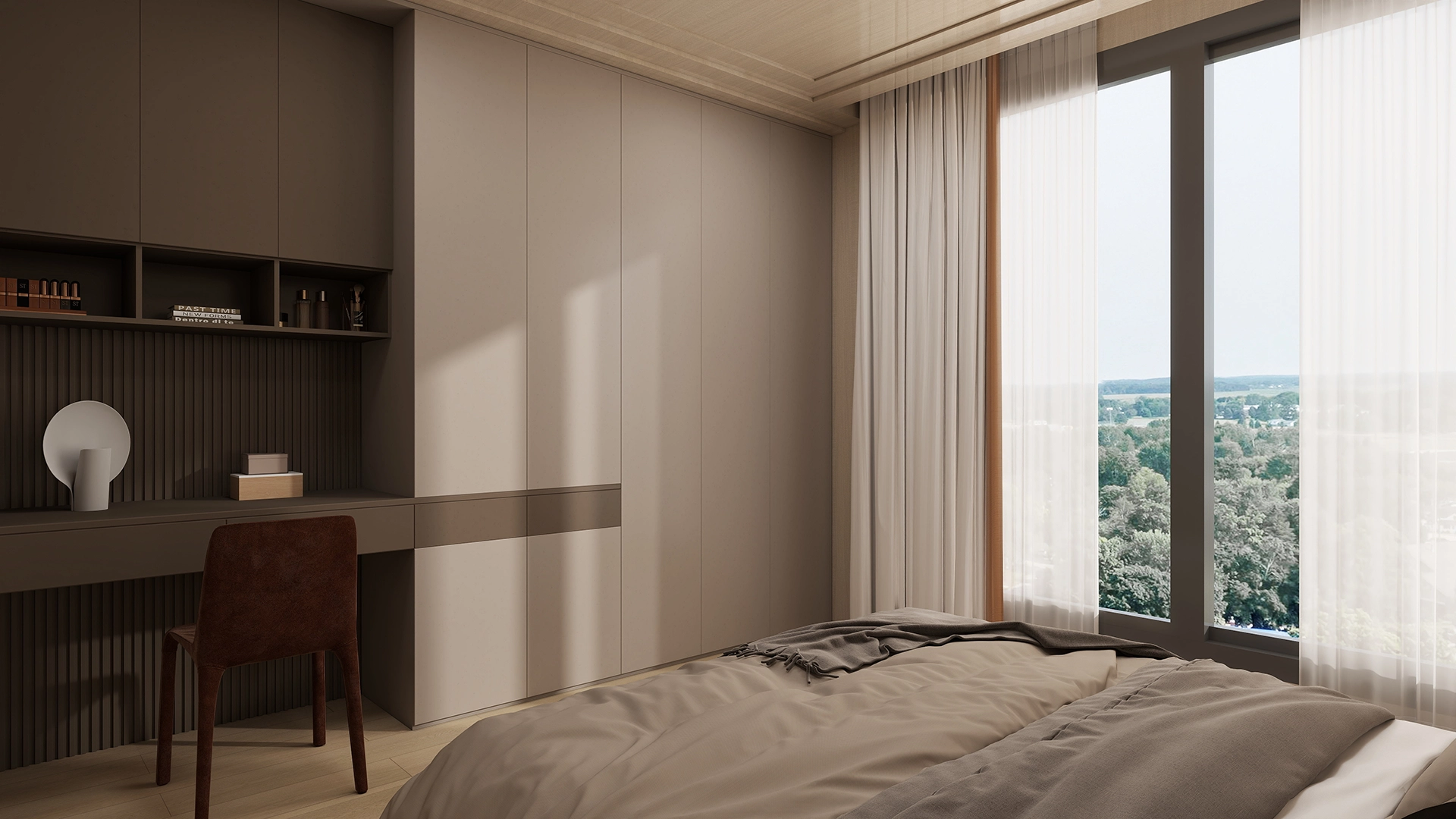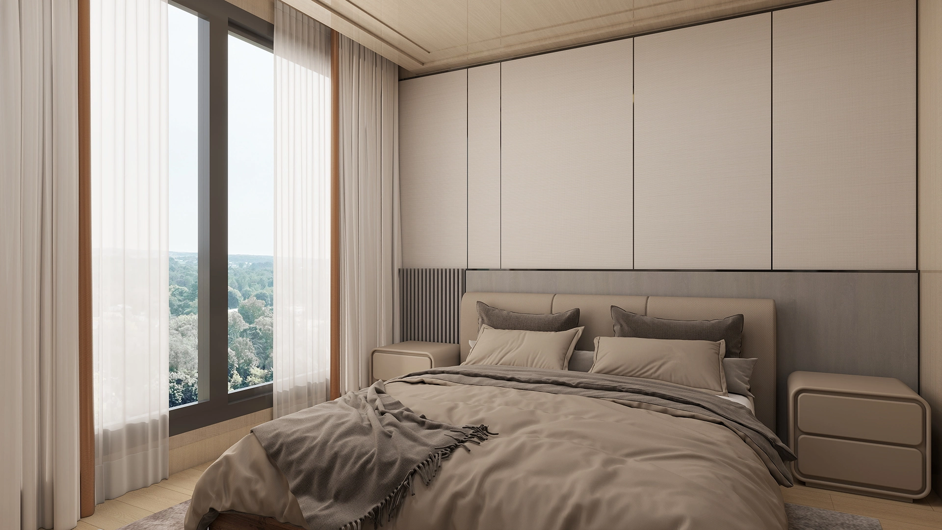 Modern Comfort: An open kitchen and living area create a spacious social environment, while two private bedrooms ensure rest. The minimalist style uses neutral colors and natural light for a warm atmosphere.
